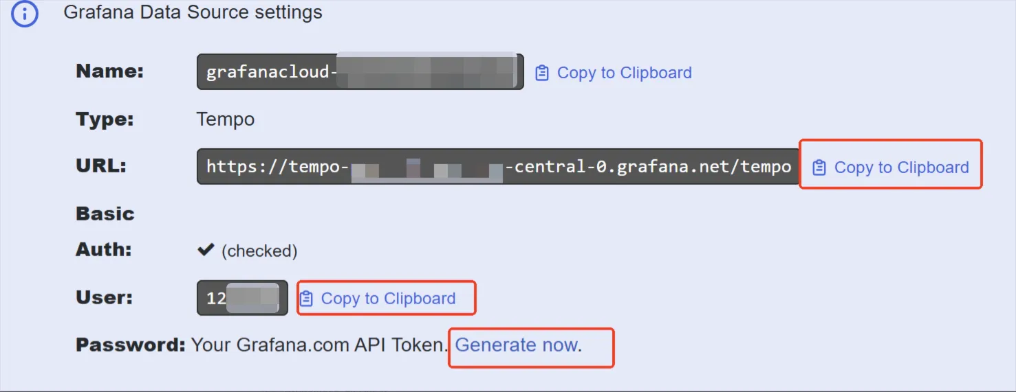 Tempo Address | Grafana Tempo server address | http://tempo-xxxxxx-xxxx.grafana.net/tempo |