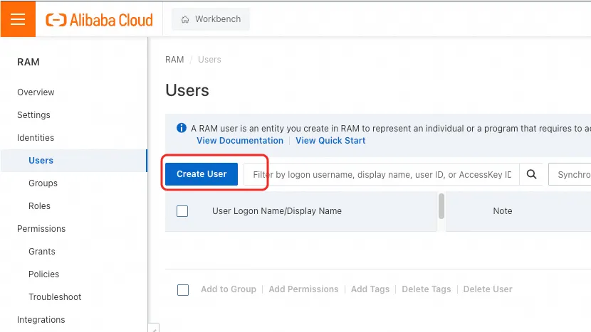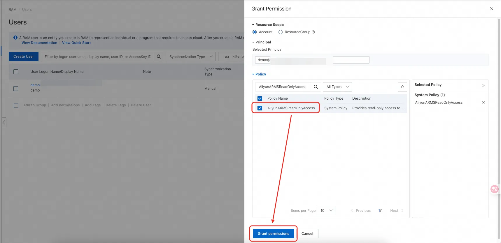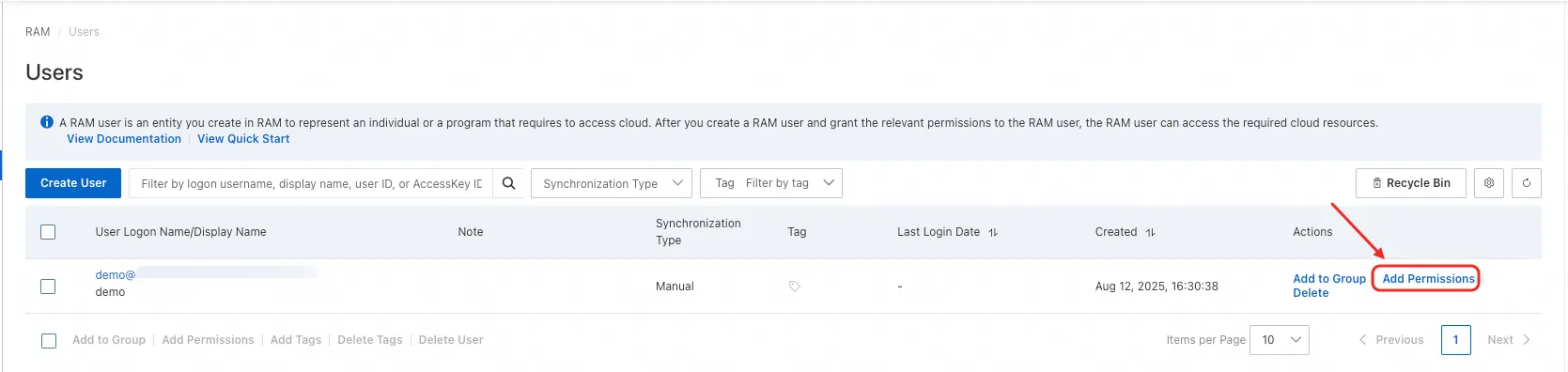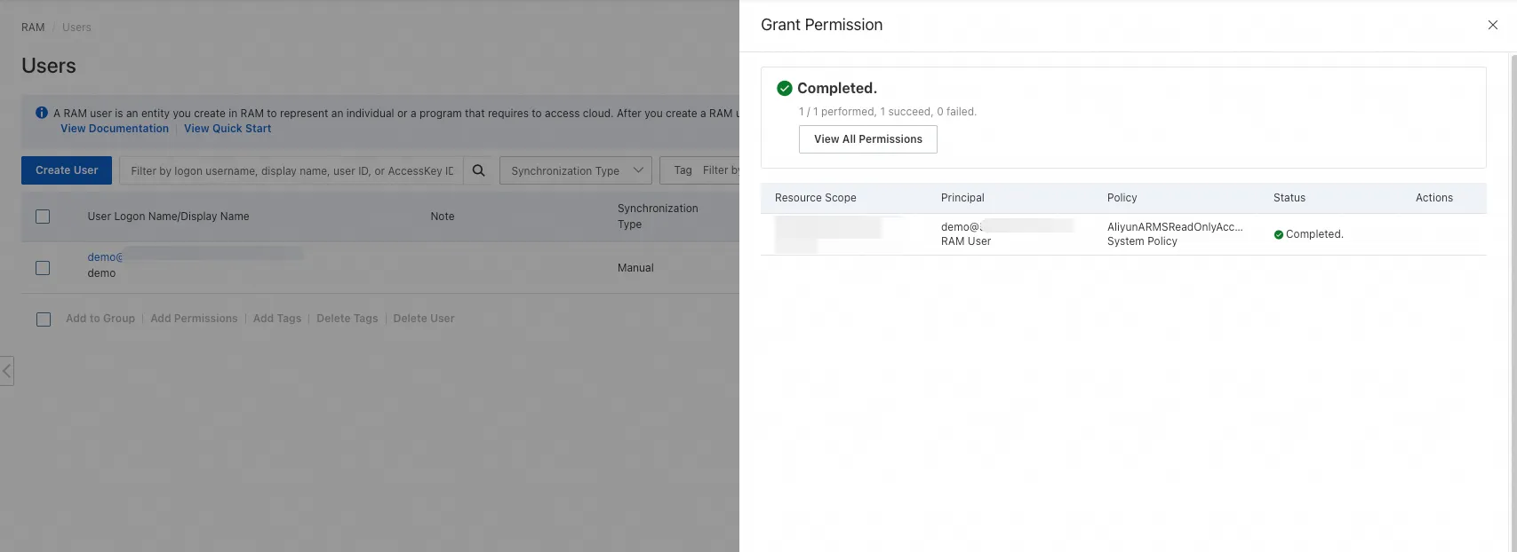 遵循阿里云最佳实践,给予 Syncause 数据对接用户最小权限。访问阿里云 RAM 用户控制台