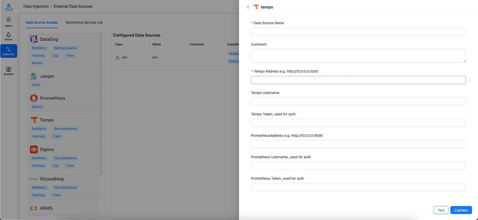 • 访问 Syncause 的 Ingrestion > External Data Sources > Tempo创建新的 Grafana Tempo 数据类型。